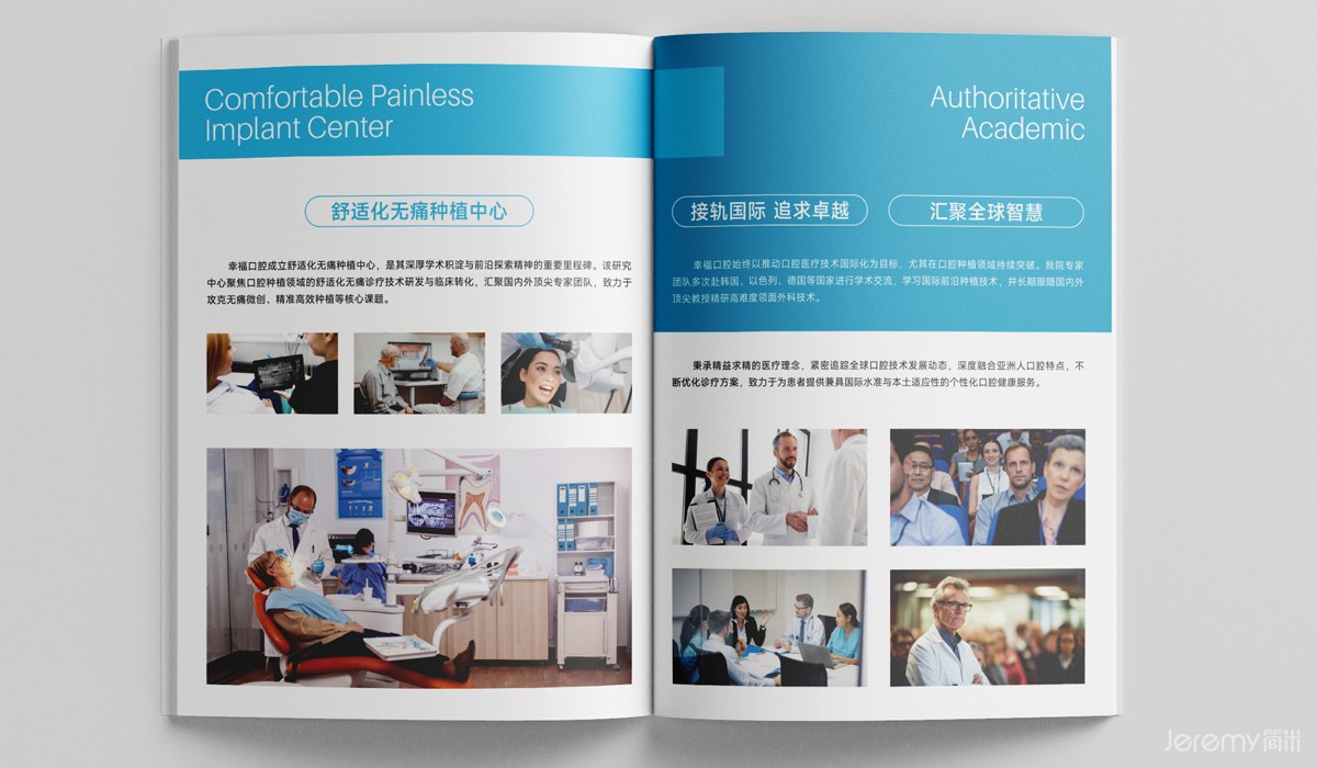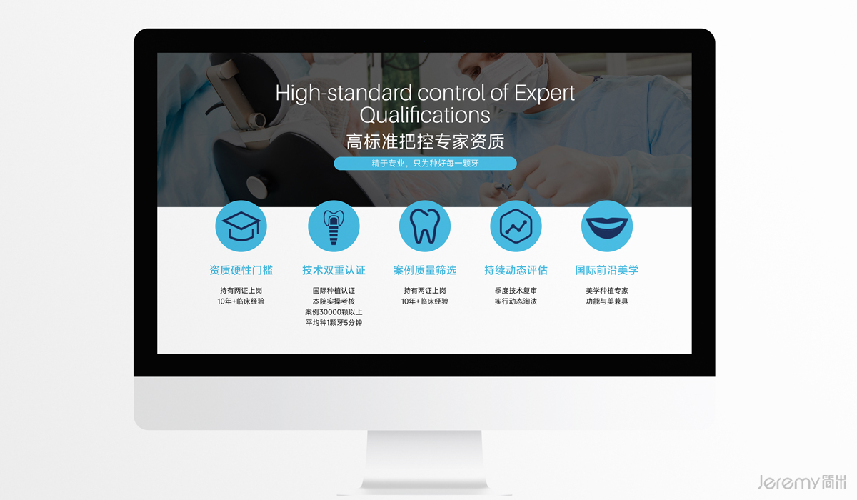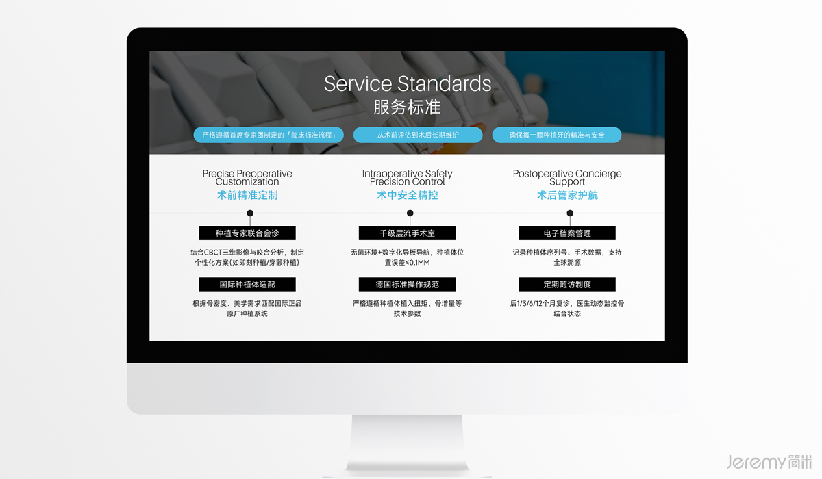流程化设计:遵循 “理念→实力→服务→保障” 阅读逻辑,页面过渡自然;“全程安心种牙” 等板块按 “术前→术中→术后” 流程设计,减少读者信息焦虑。