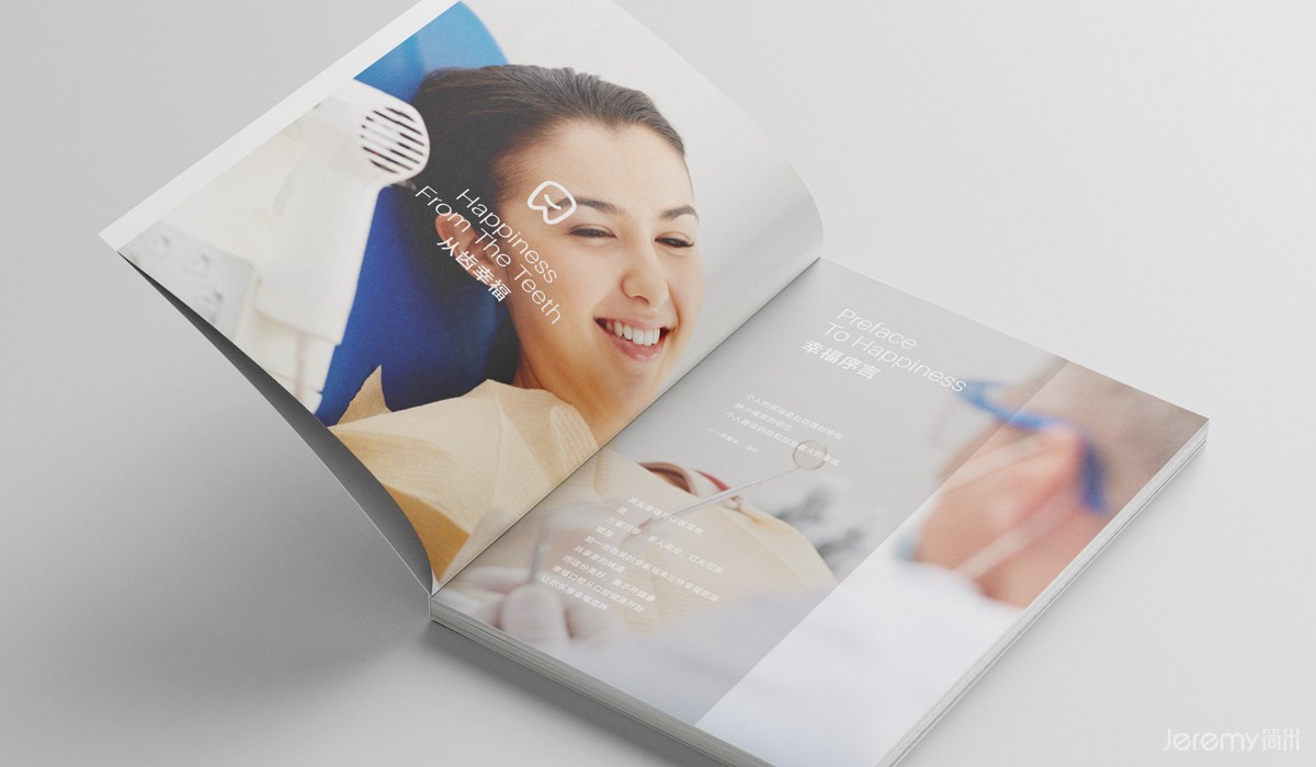 简米项目组深度拆解幸福口腔 “定义口腔舒适化诊疗新标准” 的核心定位,贯穿 “真诚、善意、美好、陪伴” 品牌精神。开篇 “幸福序言” 以幸福哲学切入,结合温暖排版与留白,打破医疗宣传冰冷感;品牌理念板块用表格模块化呈现 “标语、愿景、核心价值、精神”,突出 “从齿幸福” 等核心信息,强化品牌记忆。
