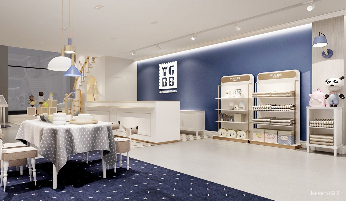 元素:我们将品牌的VI设计在空间中进行了延伸,将logo中的邮票造型在空间中穿插使用,同时将蓝色作为主要识别色,以此作为英格贝贝的专属识别符号,提升品牌识别性。