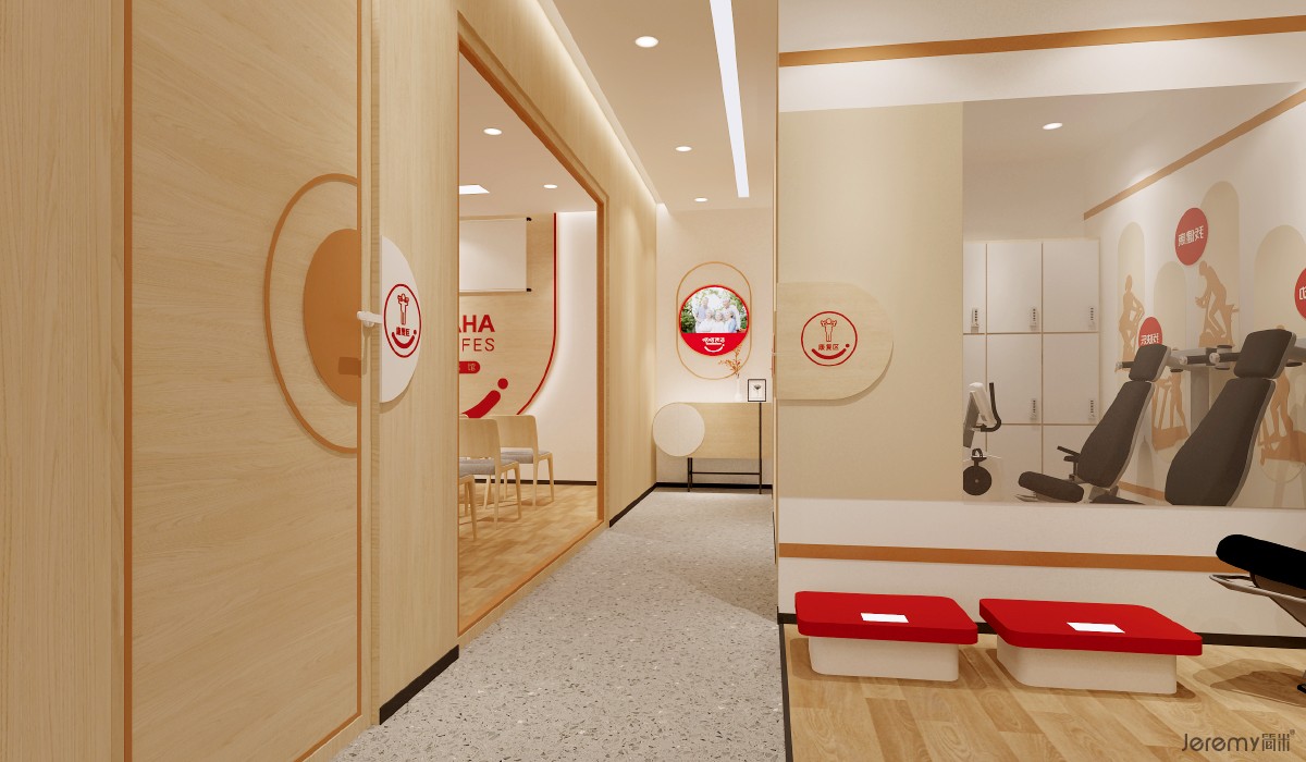 基础形态:提取品牌 LOGO 中的 “圆” 与 “方” 作为核心视觉元素 —— 圆形传递自然亲和感,消解人际隔阂;方形彰显专业严谨性,强化品牌信任度,二者形成 “柔与刚” 的平衡。材质语言:以木纹为核心肌理,搭配白色墙面与红色点缀,其中木纹象征温馨关怀,白色代表纯洁专注,红色(品牌色)注入活力热情,三重材质共同构建 “自然 - 专业 - 温暖” 的空间气质。