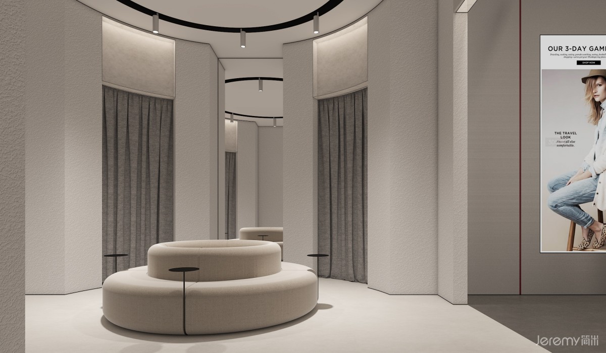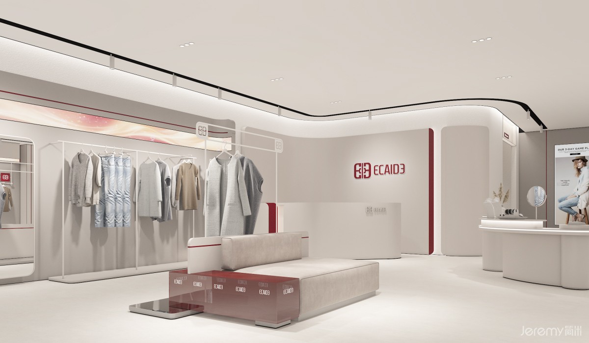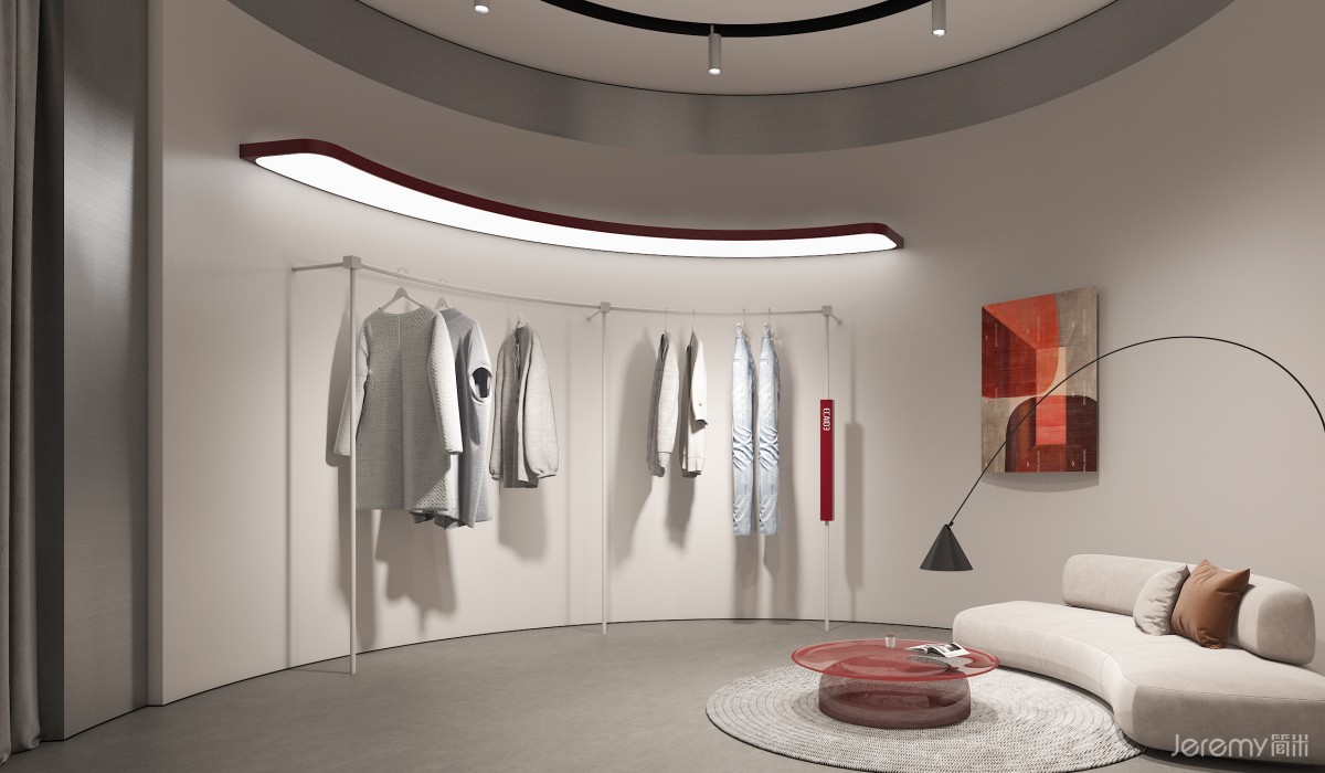 内部空间划分为产品展示、服务、休闲与 VIP 三大模块:靠墙陈列台与中岛展示区最大化利用空间,让顾客多维度浏览产品;入口模特展示台直观呈现穿搭效果,引导人流动线;饰品陈列架与陈列柜丰富展示维度,延伸品牌风格表达。收银区高效便捷,试衣间保障私密体验,休息椅与 VIP 专属区域则升级舒适感与尊贵感,全方位契合中高端客群需求。