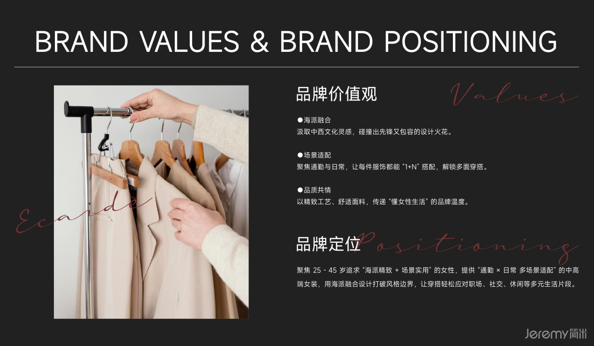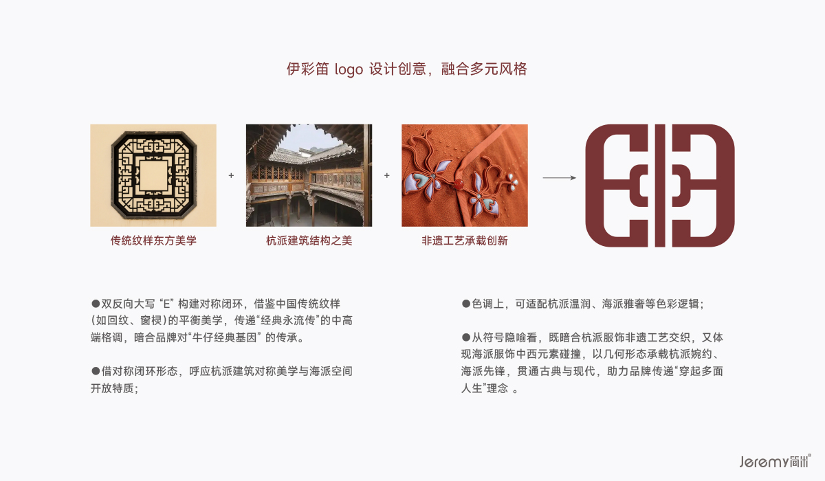 品牌视觉核心辅助形以双反向大写 "E" 构建对称闭环,灵感源自中国传统回纹、窗棂的平衡美学,既暗合杭派建筑的对称格调,又呼应海派空间的开放特质。几何形态中交织非遗工艺的匠心传承,碰撞中西文化的先锋表达,将杭派婉约与海派雅奢融于一体,精准传递 "穿起多面人生" 的品牌主张。