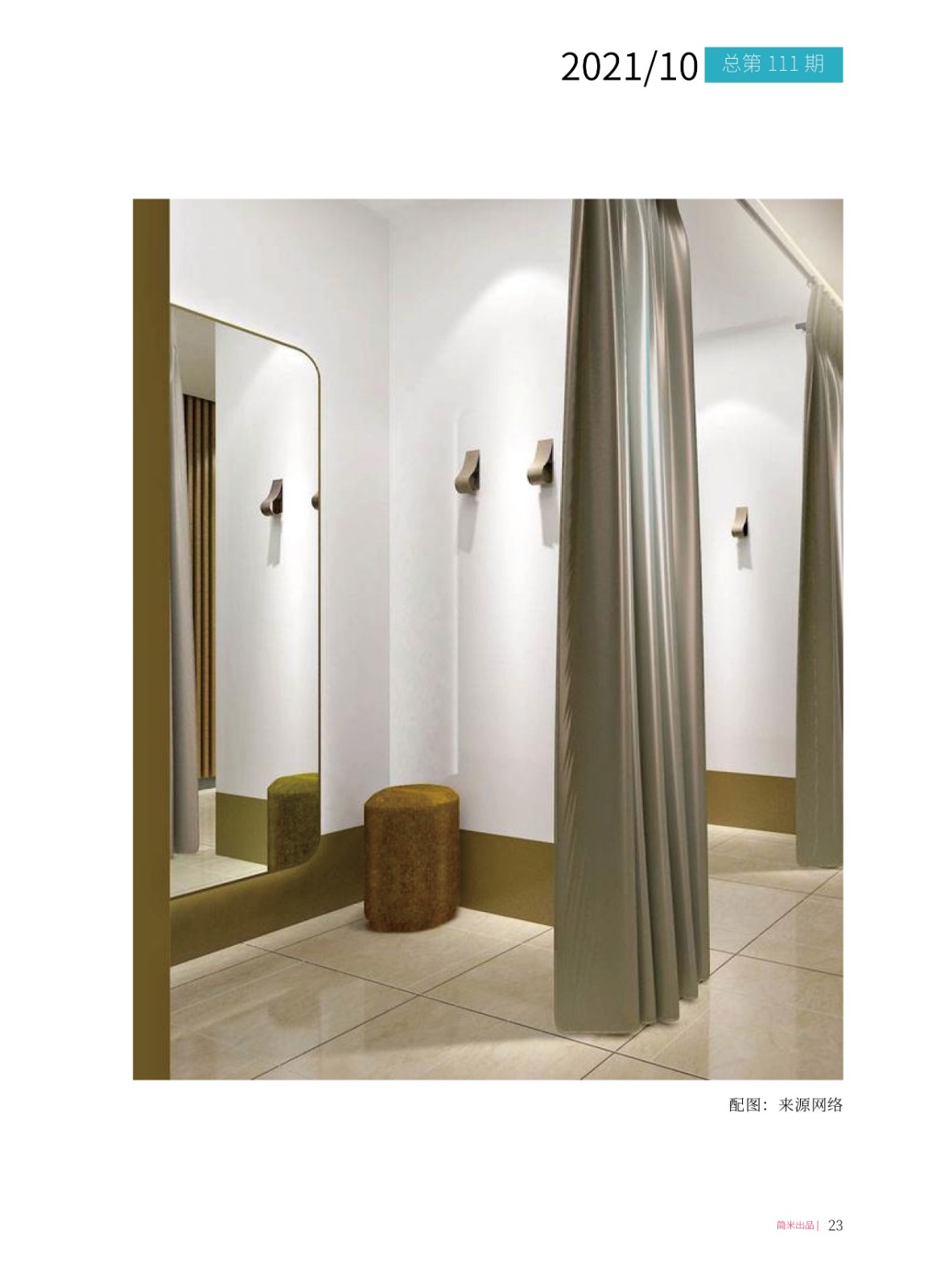 简米知识分享:试衣间的布灯原则:(1) 充足的垂直照度,阴影较弱;(2) 一般选用中光束角 LED 射灯,光线柔和选用深藏防眩灯具(3)注意灯具角度不要调节过大,避免眩光的产生,本讲简米来简单讲一讲...详见本期月刊P22-23