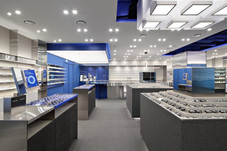 这店铺设计也是该品牌SI设计落地的一家品牌体验店设计,您可以通Rounz的尖端AI技术和IT享受“零接触”购物,该技术可以通过Roundz Mirror进行虚拟验配并找到合适的眼镜。