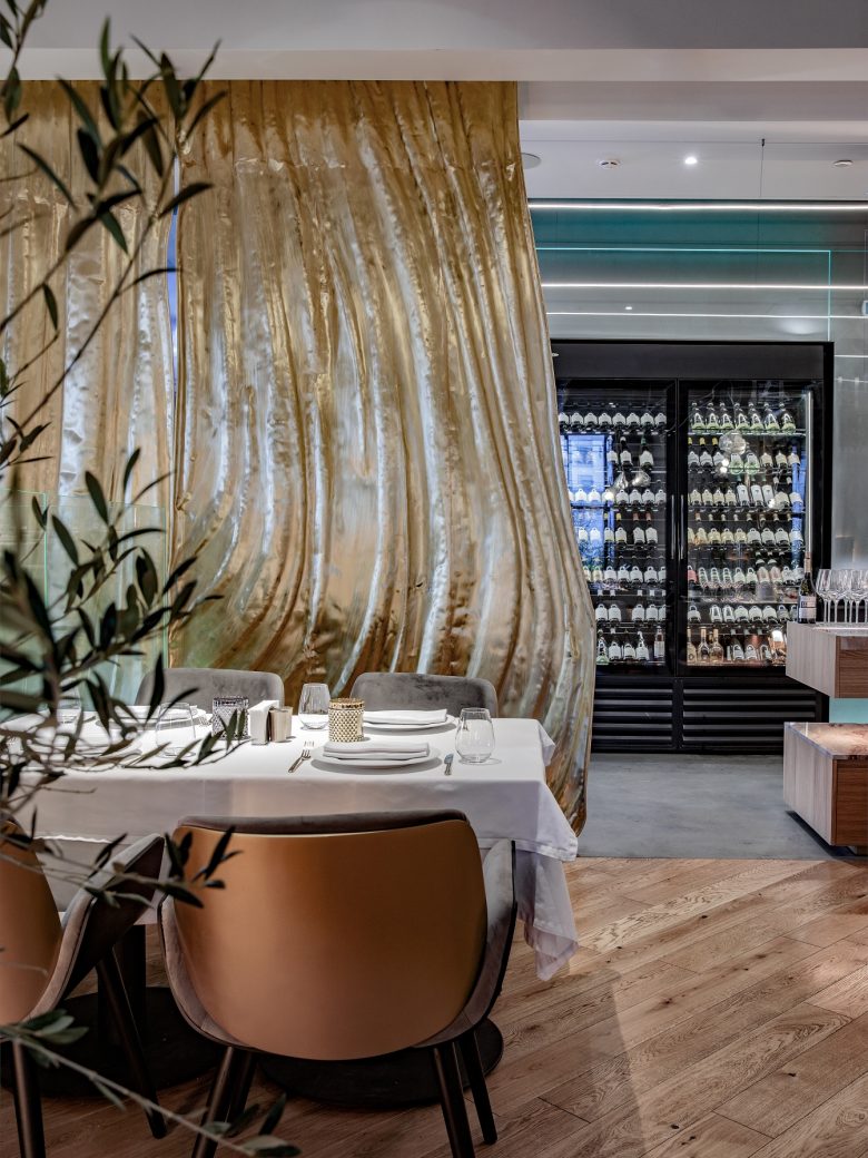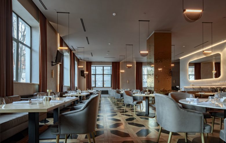 该店铺设计空间采用闪闪发光的蜂蜜色调、大理石、黄铜、霓虹灯和未来科技的概念组合。该店铺设计从街道上吸引了人们:从莫斯科河的堤岸可以看到发光的拱形窗户,透过它们直接看到天花上类似于大棒棒糖一样的装饰灯。